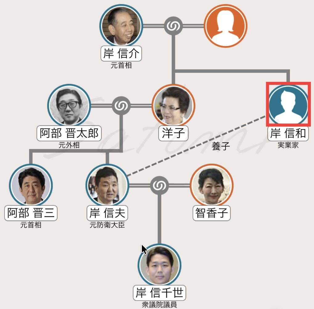 岸信和氏は実業家で、岸信千世氏の父親で岸信夫氏を、子供の頃に岸家の養子として迎え入れました。